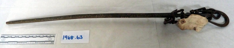 About this objectA steelyard or steelyard balance is used to weigh objects. Diamond section arm with notches & engraved figures. Supported by large hook over a pointer. Two hanging brackets below, one with a hook. Donated as part of a set of tools in 1968. The tools included a pitchfork head, bricklayer's trowel and a carpenter's auger. The tools of someone doing a number of physical jobs. Perhaps the user was a farmer, who would need to be multi skilled to maintain their farm. Or maybe the original user was a handyman, happy to turn their skills and tools to any task.