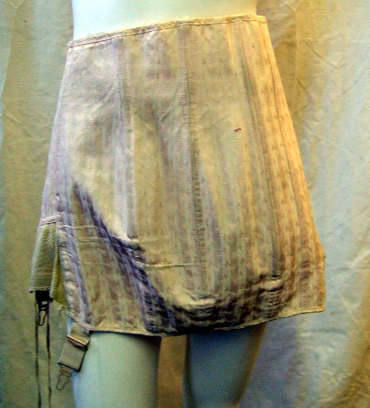 About this objectWoman's corset in pink cotton synthetic? material. Fabric patterned with woven satin stripe and scattered flecks. Length, reaches from just above waist to top of thighs. Opening cf. Fastening of lace to adjust width, and hooks and studs to close. Originally 6 suspenders, 2 now missing. 12 bones, longer at back than front. Only front overlap piece is lined, in pink cotton. Elastic panels, at side fronts and base.