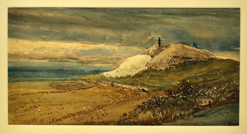 About this objectWatercolour, William Ransom excavating Pegsdon tumulus. A silk-hatted man and kneeling figure on a large chalk mound at right in field. This documents Ransom’s excavation of the barrow at Knocking Knoll on the border between Pirton (Hertfordshire) and Pegsdon (Bedfordshire).